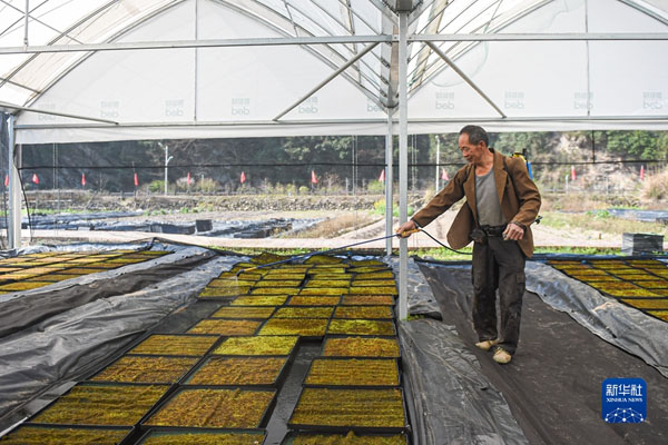 在浙江省景宁畲族自治县毛垟乡苔藓种植基地的大棚内,村民为苔藓喷洒营养液(2021年2月24日摄)。新华社记者 江汉 摄