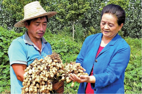正值花生收获季节,郭建华(右)来到开封市祥符区西姜寨乡,与农民一起查看花生收成情况。