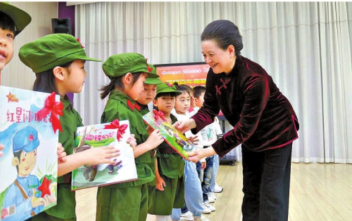 郭建华走进开封市金明幼儿园,向孩子们赠送图书。