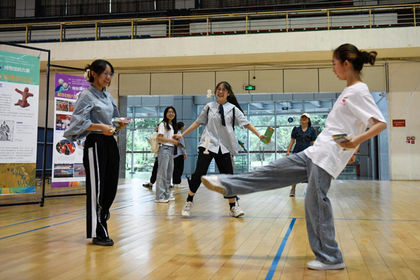 5月23日,在四川大学江安校区体育馆,学生在体验传统体育项目踢毽子。新华社记者 胥冰洁 摄
