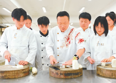 江苏省连云港市东海县中等专业学校老师正在指导学生练习刀工。张玲摄(人民视觉)