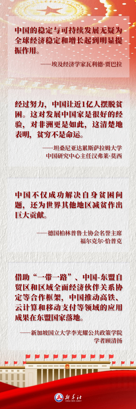 中国经济社会发展取得的历史性成就吸引世界目光。“经过努力,中国让近1亿人摆脱贫困。这对发展中国家是很好的经验,对非洲更是如此,这清楚地表明,贫穷不是命运。”坦桑尼亚达累斯萨拉姆大学中国研究中心主任汉弗莱·莫西说。