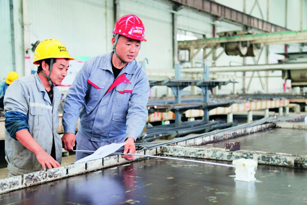 殷翠平代表(右)与工友正在测量安装配件。摄影/赵祯祺