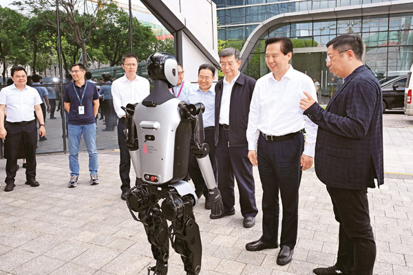 5月15日,广东省人大常委会主任黄楚平(右二)调研人形机器人发展情况。摄影/刘宇韬