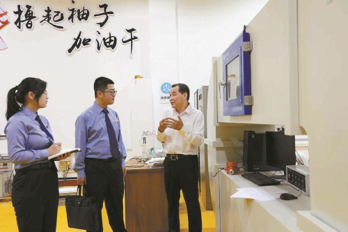 2025年9月,南阳市检察院检察官来到南阳防爆电气研究所走访全国人大代表王军(右一),了解企业发展中遇到的法律问题。
