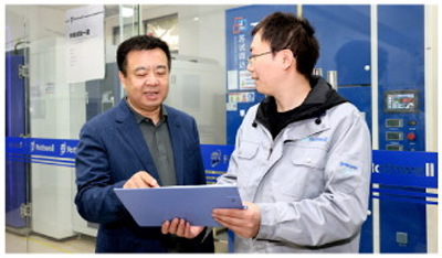 图为全国人大代表周善红(左)在江苏某电气公司调研
