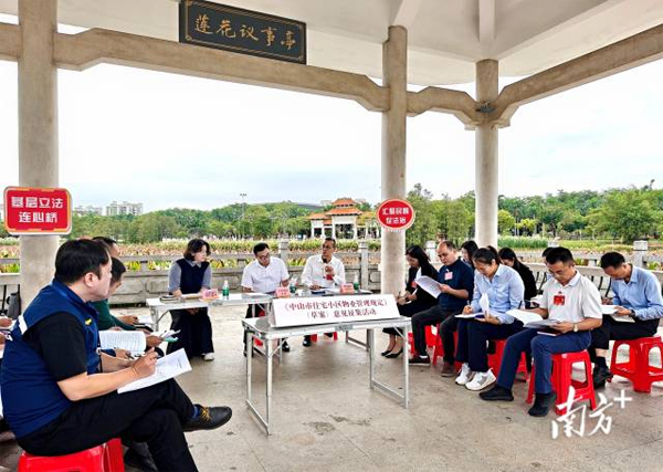得能湖公园莲花议事亭内,一场关于《中山市住宅小区物业管理规定(草案)》的意见征集正展开,居民代表们坐着被称为广东特色的“省凳”——红板凳,把日常遇到的物业痛点、治理建议一一道出,参会的人大代表们认真记录着每一条“心里话”。