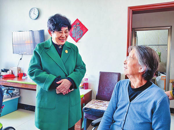 张淑芬(左)在养老服务中心看望老人,了解老人生活情况和需求。陈冰 摄