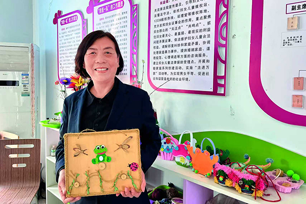 为动员留守妇女参与环保行动,曹兰英代表加入“绿城妈妈”志愿队伍,与妇女一同编织手工制品。摄影/徐航