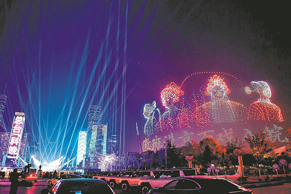 2025年11月19日晚,合肥市天鹅湖,2025总台“科晚”——《中国科技创新盛典》录制现场无人机表演,吸引市民前来观看。安徽日报通讯员 陈三虎 摄