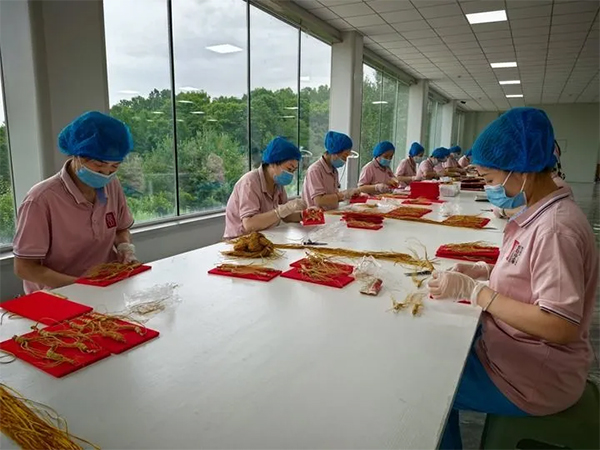 在吉林博大农林生物科技有限公司,工人们对人参进行分拣(2025年7月15日摄)。新华社记者 张博宇 摄