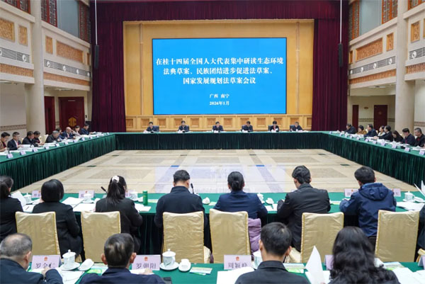 1月13日,在桂十四届全国人大代表集中研读生态环境法典草案、民族团结进步促进法草案和国家发展规划法草案会议在广西人民会堂召开,自治区人大常委会副主任、党组书记方春明主持会议并作部署讲话,自治区人大常委会副主任、党组副书记何文浩就三部法律草案作讲解辅导,自治区高级人民法院院长、党组书记黄海龙等62名在桂全国人大代表参加。