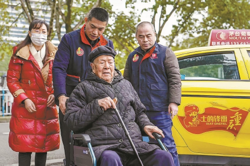 殷其龙(左二)送独居老人胡爷爷前往医院体检。