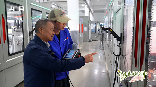 李安锐(左一)指导工友生产工序细节把控(央广网发 贾洁楠 摄)