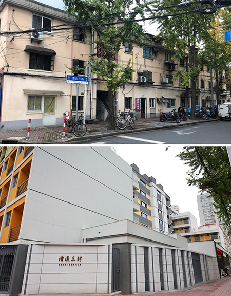 拼版照片:上图是改造前的上海市徐汇区漕溪三村小区居民楼外景(资料照片,新华社发);下图是拆除重建后的漕溪三村小区居民楼外景(2025年10月23日摄,新华社记者方喆摄)。