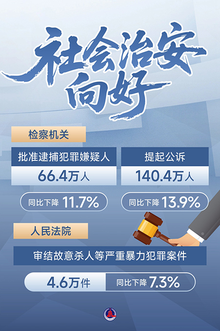 ——社会治安向好,检察机关批捕、起诉人数均同比下降10%以上。