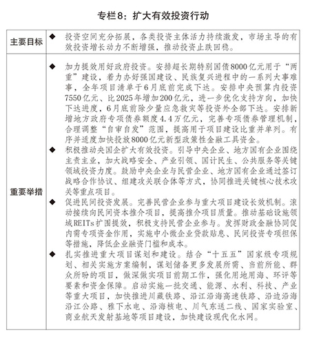 二是投资补短板调结构加力增效。统筹用好各类资金支持重点项目建设,持续优化中央预算内投资结构,扩大地方政府专项债券投向领域和用作资本金范围,指导专项债券“自审自发”地区扎实有序开展相关工作。推动“十四五”规划102项重大工程项目顺利实现规划目标任务,开工建设雅下水电等标志性工程。现代化基础设施体系建设深入推进,国家综合立体交通网“6轴7廊8通道”加速完善。规范和加强中央投资项目审批管理,提高政府投资效益。出台进一步促进民间投资发展政策措施。滚动向民间资本推介5400多个项目,涉及总投资超过3.9万亿元。加大基础设施竞争性领域向各类经营主体公平开放力度,5个新核准核电项目引入民间资本参股比例最高达20%,大渡河丹巴水电站等项目加快引入民间资本。推动基础设施领域不动产投资信托基金(REITs)扩围扩容,算力设施、城镇供热、农贸市场、城市更新、专业仓库等领域实现“首单”发行。2025年工业投资、制造业投资分别增长2.6%、0.6%。