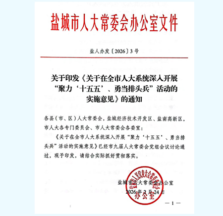 会上印发的《关于在全市人大系统深入开展 “聚力‘十五五’、勇当排头兵”活动的实施意见》,明确坚持党的全面领导、服务中心大局、依法履职尽责、全过程人民民主、守正创新实干的原则,锚定五大发展目标:立法质量和效率进一步提升、监督工作的刚性和实效进一步增强、讨论决定重大事项的机制进一步健全、支持和保障代表依法履职的机制进一步完善、四个机关”建设全面加强,组织动员全市各级人大和全体人大代表,以更昂扬的精神状态、更务实的责任担当,积极投身“十五五”经济社会发展,奋力推动中国式现代化盐城新实践迈出坚实步伐。