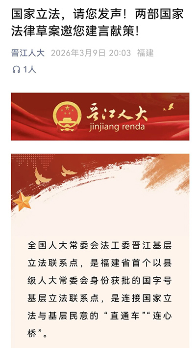 国家立法,基层有声。晋江基层立法联系点就《中华人民共和国注册会计师法(修正草案)》广泛征集意见建议。联系点发挥“市—镇(街道)—村(社区)”三级网络,坚持多点覆盖、多层发动、多方参与,贯通法治建设“最初一公里”与“最后一公里”,让原汁原味的“晋江声音”直达国家立法机关。