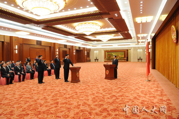 4月28日,十二届全国人大常委会在北京人民大会堂举行宪法宣誓仪式。全国人大常委会副委员长李建国主持并监誓。 中国人大网李杰摄