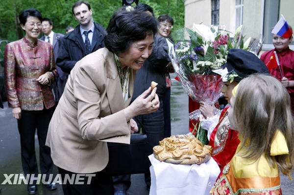 5月14日,吴邦国委员长夫人章瑞珍来到莫斯科市立实验学校,与师生们进行亲切交谈,感谢他们为中俄文化交流作出的贡献。她还观看了学生表演的武术、中文诗朗诵和绕口令等。这是章瑞珍在学校门前受到欢迎。新华社记者鲁金博摄