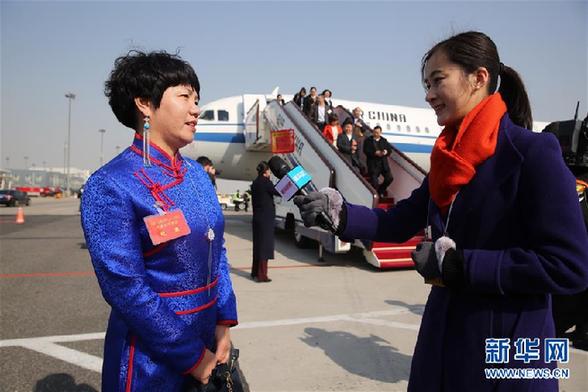 3月2日,出席十三届全国人大一次会议的内蒙古代表团乘坐飞机抵达北京。这是全国人大代表娜仁图雅(左)在接受记者采访。 新华社记者金立旺摄