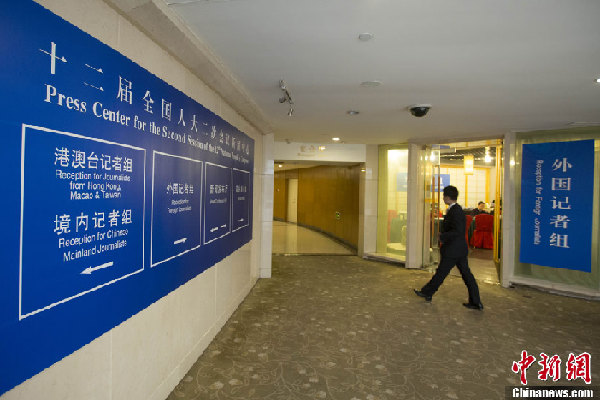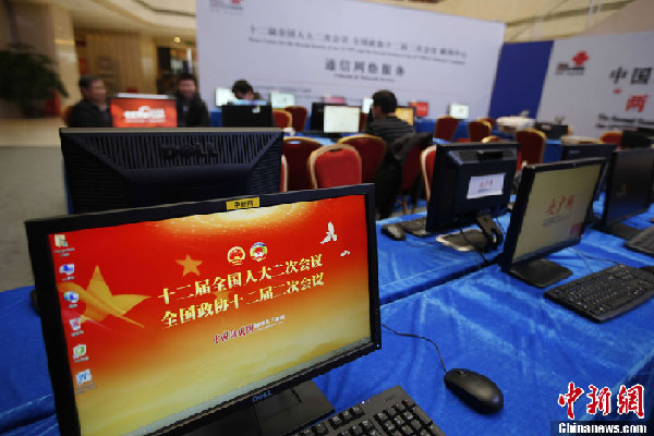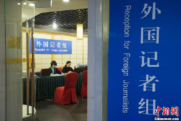 2月26日,设在北京梅地亚中心的全国两会新闻中心正式启用,中心工作人员开始接待和安排中外记者采访。十二届全国人大二次会议和全国政协十二届二次会议将于3月初开幕。中新社发盛佳鹏 摄