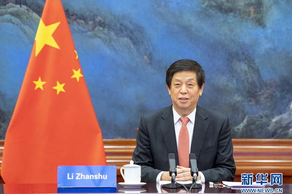 1月25日,全国人大常委会委员长栗战书在北京人民大会堂以视频方式同伊朗议长卡利巴夫举行会谈。新华社记者 高洁 摄