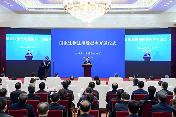 2月24日,中共中央政治局委员、全国人大常委会副委员长王晨在北京出席国家法律法规数据库开通仪式并讲话。新华社记者 张领 摄