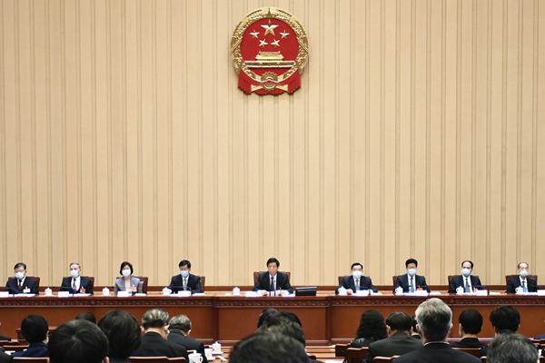 3月4日晚,十三届全国人大四次会议主席团在北京人民大会堂举行第一次会议。全国人大常委会委员长栗战书主持会议。 新华社记者 谢环驰 摄