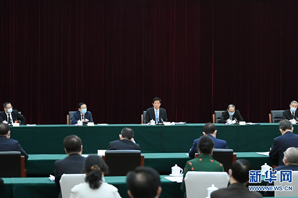 3月6日,中共中央政治局常委、全国人大常委会委员长栗战书看望出席全国政协十三届四次会议的致公党、侨联、对外友好界委员并参加讨论。新华社记者 申宏 摄