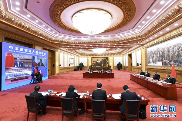 4月16日下午,国家主席习近平在北京同法国总统马克龙、德国总理默克尔举行中法德领导人视频峰会。新华社记者 岳月伟 摄