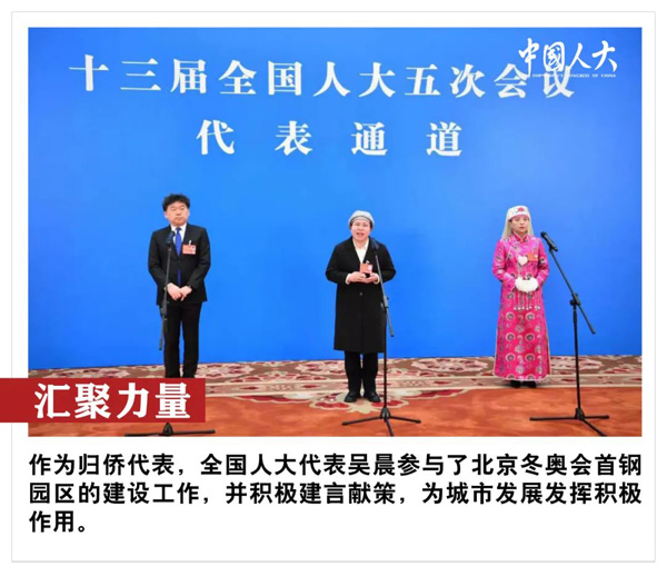 “广大归侨侨眷是祖国建设和发展的重要力量,作为一名归侨,我参与了北京冬奥会首钢园区的建设工作,将首钢园区带到世界的眼前,成为点燃北京高光时刻的焦点之一。”全国人大代表,北京市建筑设计研究院有限公司总建筑师、首钢集团总建筑师吴晨说。