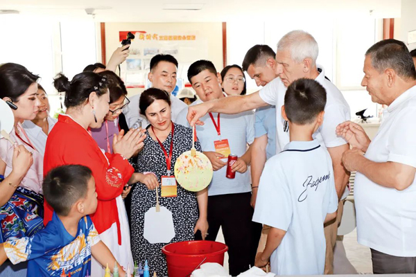 社区里,孩子们正在老师的带领下免费学习制作漆扇、编绳和艾特莱斯包等中国传统工艺。调色、浸染、晾干……马特钦和孩子们一起制作了漆扇并拍照留念。
