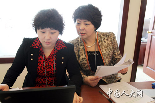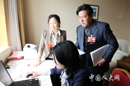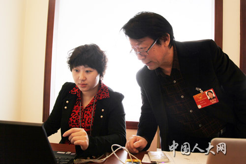 3月9日中午12时,是十一届全国人大五次会议提交议案的截止时间。图为两名工作人员在紧张的录入议案信息。王芳 摄