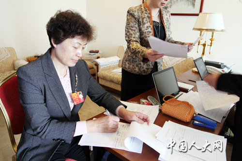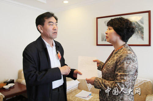 3月9日中午12时是十一届全国人大五次会议提交议案的截止时间。图为两位代表提交议案。王芳 摄