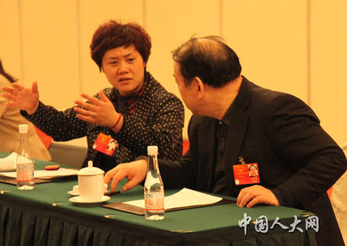 3月13日,山东代表团审议各项决议草案和关于修改刑事诉讼法的决定草案建议表决稿等。图为代表在交流。张庆水摄