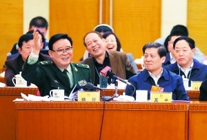 3月9日,魏哲代表(前排左一)呼吁早日看到中国的国车和国服,他幽默诙谐的发言令全场气氛非常活跃。(戴冰 摄)