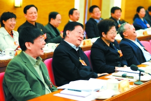 3月9日,赵凯代表(前排左二)在小组会上提出加强公务员诚信建设特别重要,要把诚信纳入各级政府与公务员的政绩考评范围。(戴冰 摄)