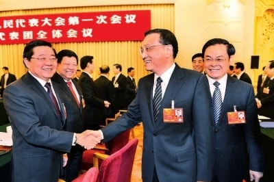 3月10日下午3时,在中央书记处书记、十一届全国政协副主席杜青林,吉林代表团团长王儒林、副团长巴音朝鲁等陪同下,李克强神采奕奕走到吉林省代表们中间,与大家一一握手、互致问候。会场内,掌声、笑声连绵不断,感动、激动真挚流露,亲情、温情如潮涌动。记者 宋锴 摄