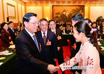 8日上午,张德江参加广东代表团审议。图为张德江与来自深圳的农民工代表易凤娇亲切握手。(王辉 摄)