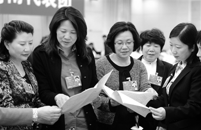 3月8日,人大河南代表团在驻地分组审议政府工作报告,审查计划报告和预算报告。李海燕、霍金花、高阿莉(从左至右)等几位来自基层的女代表,就保障和改善民生等话题反复推敲。