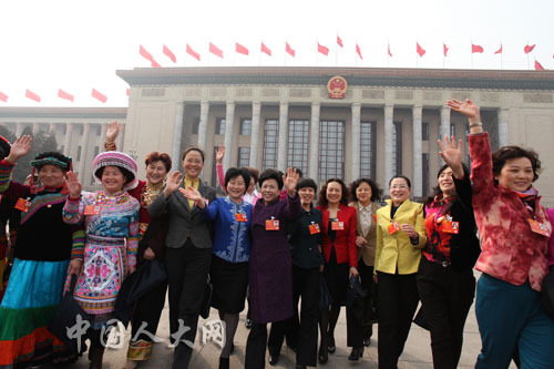 3月8日下午15时,第十二届全国人民代表大会第一次会议举行第二次全体会,听取全国人大常委会委员长吴邦国作全国人民代表大会常务委员会工作报告。图为女代表场外合影。罗荣 摄