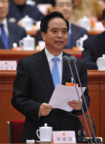 3月8日下午15时,第十二届全国人民代表大会第一次会议举行第二次全体会,听取全国人大常委会委员长吴邦国作全国人民代表大会常务委员会工作报告。图为大会主席团常务主席、执行主席李建国主持会议。中国人大网 李杰 摄