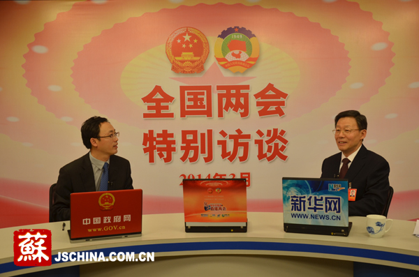 正在参加十二届全国人大二次会议的全国人大代表、省长李学勇,3月8日下午应约接受了新华网的专访。李学勇在访谈中说,今年是江苏转型发展深入推进、各项改革全面展开的关键一年。我们要深入贯彻落实党的十八、十八届二中三中全会和习近平总书记系列重要讲话精神,坚持稳中求进、改革创新,增强宗旨意识,弘扬担当精神,切实加强作风建设,汇聚起全面深化改革、推动转型发展的强大力量,奋力谱写好中国梦的江苏篇章。