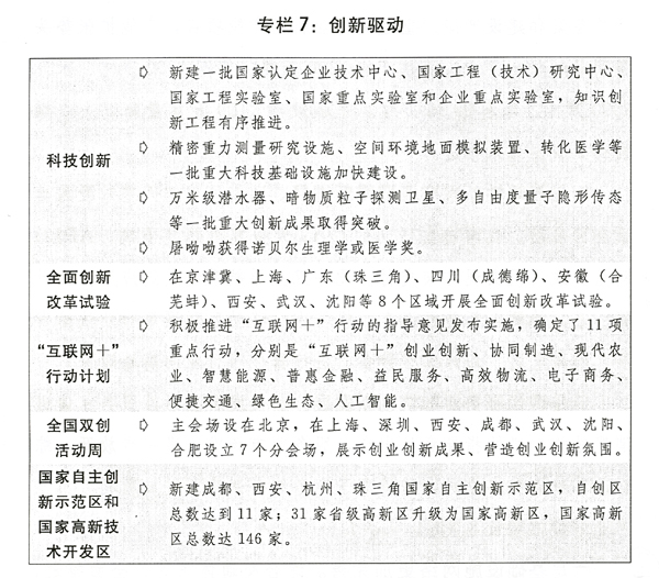 (三)坚持创新驱动发展,新产业新业态加快形成。出台深化体制机制改革加快实施创新驱动发展战略的若干意见,推进全面创新改革试验,大力推动创新和产业升级。