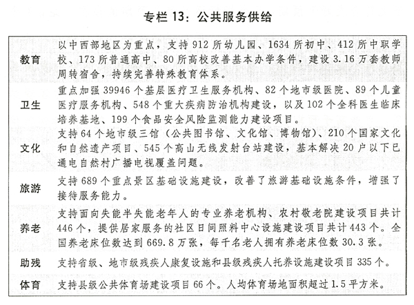四是公共服务供给水平进一步提升。贫困地区义务教育薄弱学校办学条件持续改善,乡村教师支持计划启动实施,农村贫困地区学生进入重点大学渠道进一步畅通。九年义务教育巩固率、高中阶段教育毛入学率分别达到93%和87%。基层医疗服务体系、重大疾病防治体系、全科医生培养基地建设加强,人均基本公共卫生服务经费达到40元,服务项目扩大到12类。国家基本公共文化服务指导标准发布实施,地市级公共文化服务设施建设支持力度加大。体育产业创新发展取得积极进展。