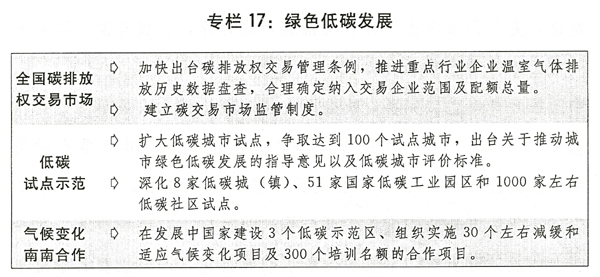 四是提升低碳发展水平。继续推进低碳试点示范。加快建设全国碳排放权交易市场,制定交易、监管等配套细则。建设性参与国际谈判,做好巴黎协定后续机制设计和推动落实,主动引导全球气候治理规则制定,继续加强气候变化“南南合作”。