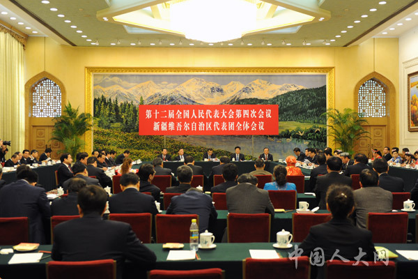3月10日上午,十二届全国人大四次会议新疆维吾尔自治区代表团举行全体会议。中国人大网 李杰 摄