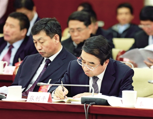 张利平代表(右)参加审议慈善法草案修改稿和“两高”工作报告时,认真做笔记。 内蒙古日报社融媒体全国两会报道组记者 于涛摄